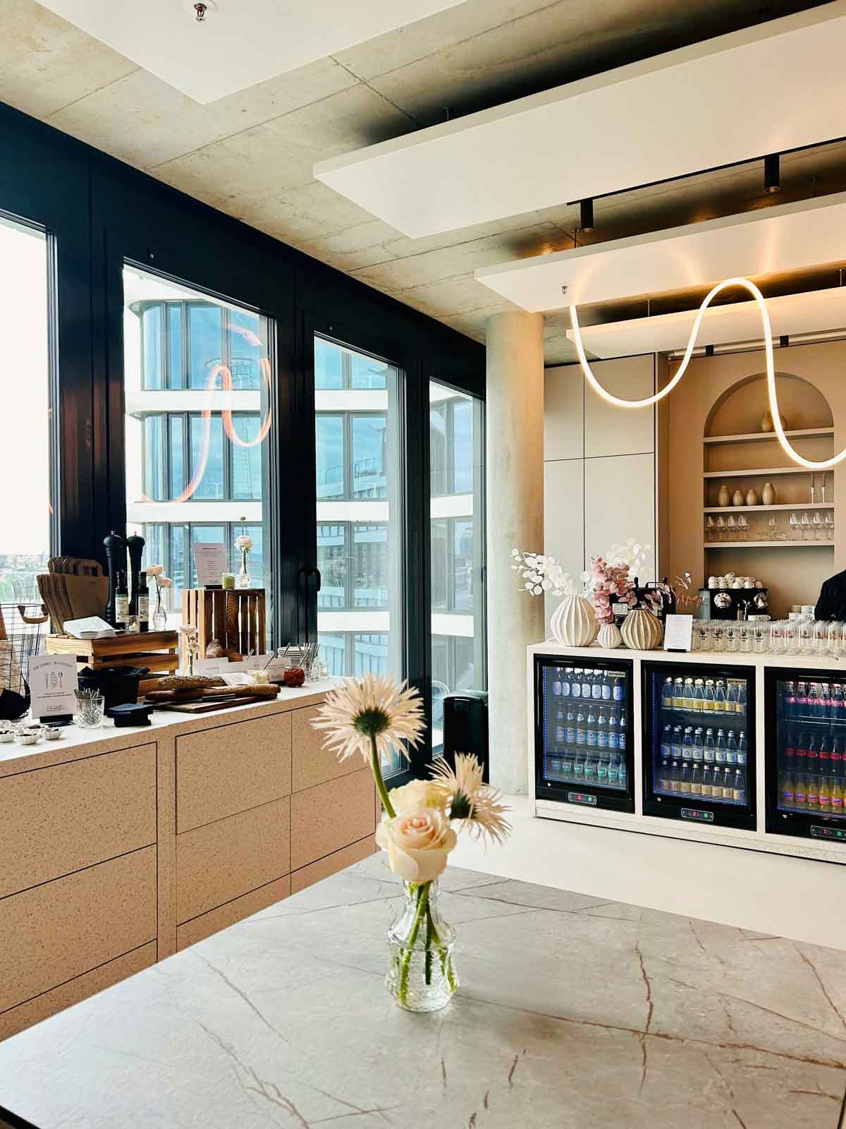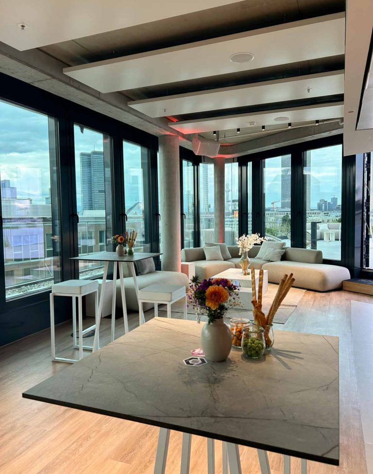 Die Location Place to be im Westend Tower ist für 50 Personen (sitzend) bzw. maximal 75 Personen (stehend) ausgelegt.