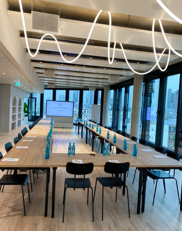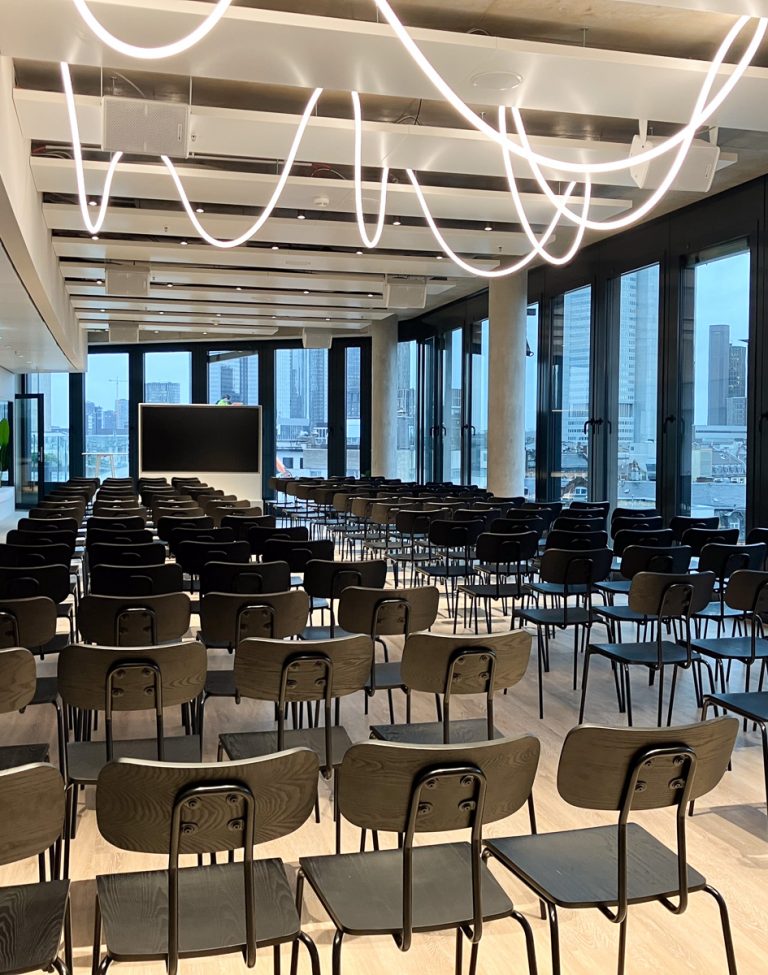 Unsere Eventlocation in Frankfurt verfügt über einen modernen, vollausgestatteten exklusiv nutzbaren Raum, mit großartigem Blick auf die Skyline Frankfurts. Durch den Flur, welcher ebenfalls nur exklusiv genutzt wird, kommt man auf unsere 100qm große Dachterrasse, welche euch ebenfalls zur Verfügung steht.